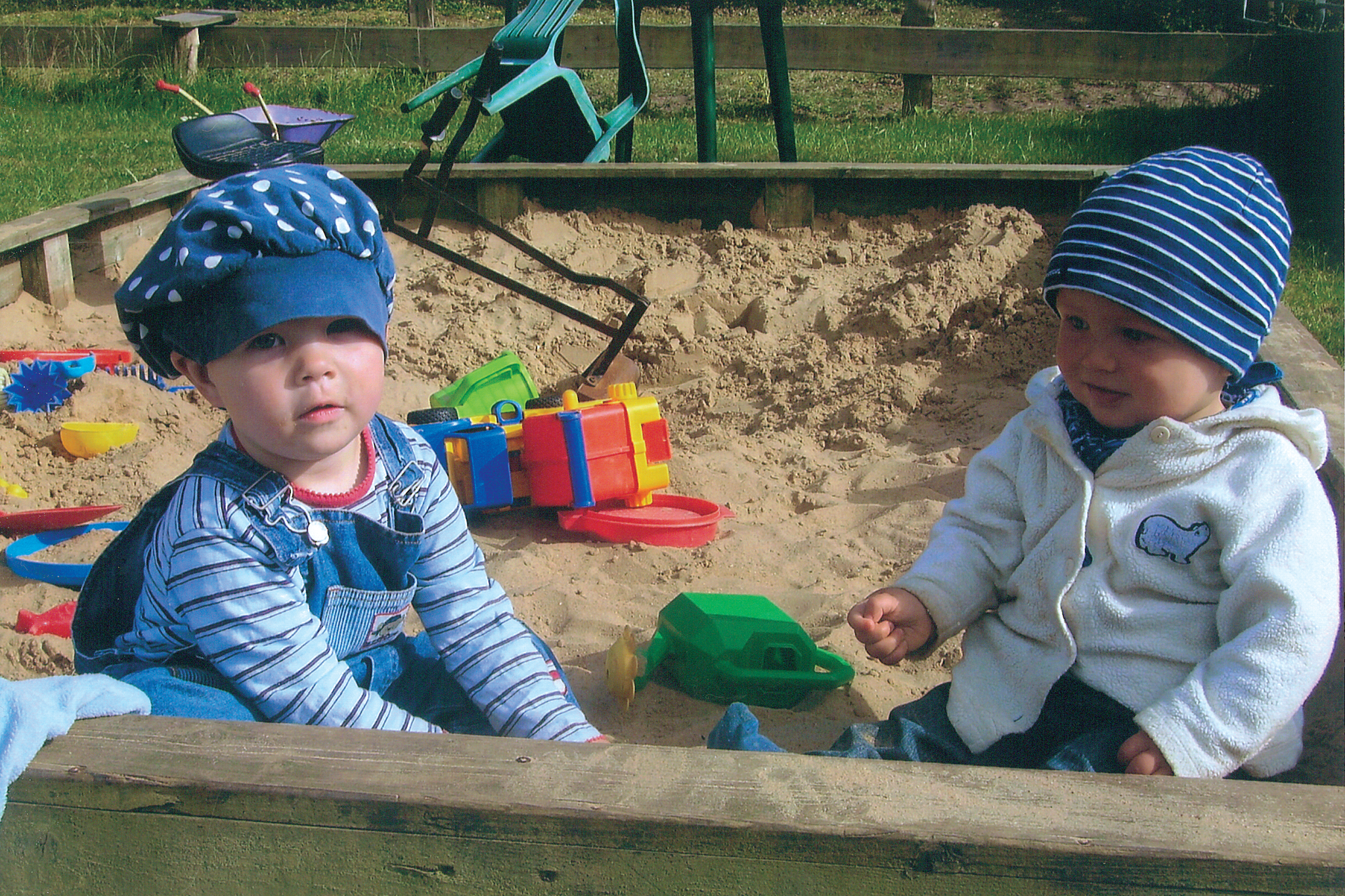 Im großen Sandkasten mit dem Bagger buddeln und mit Förmchen "Kuchen backen"