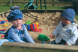 Im großen Sandkasten mit dem Bagger buddeln und mit Förmchen "Kuchen backen"
